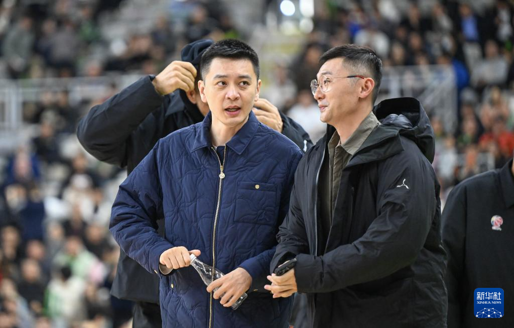 2月6日,前中国篮球运动员杨鸣(前左)和刘炜在场休息时交流。