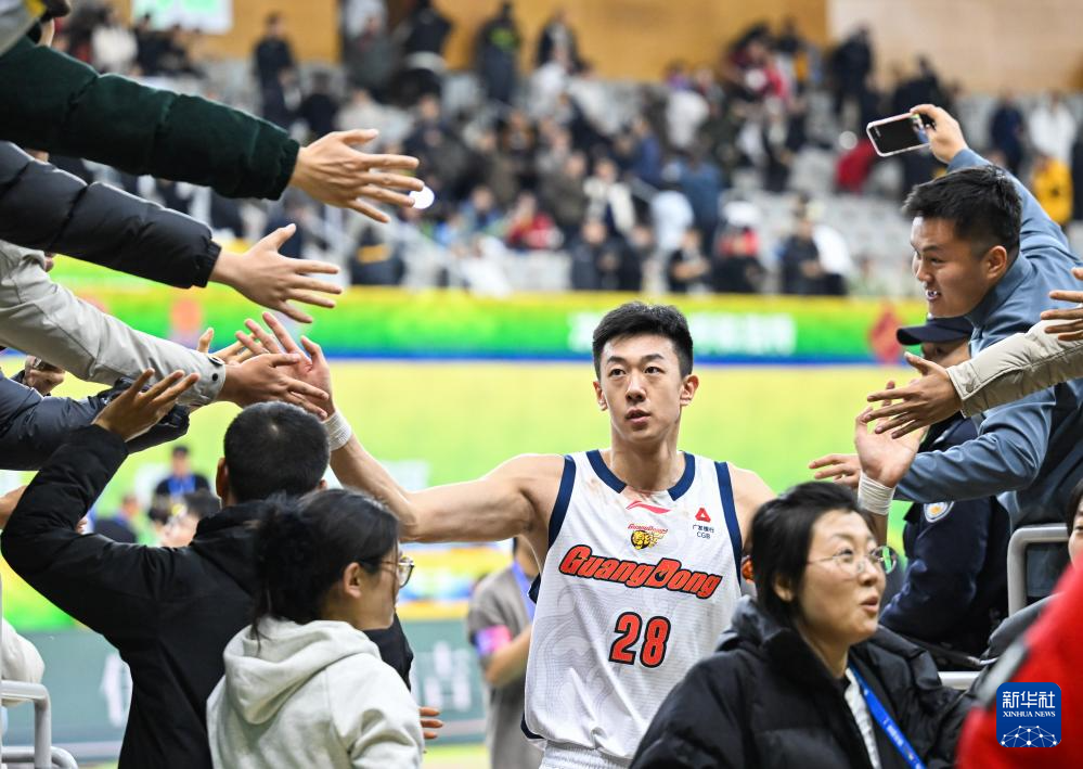 2月6日,广东东阳光队球员王少杰(中)在赛后与观众击掌。