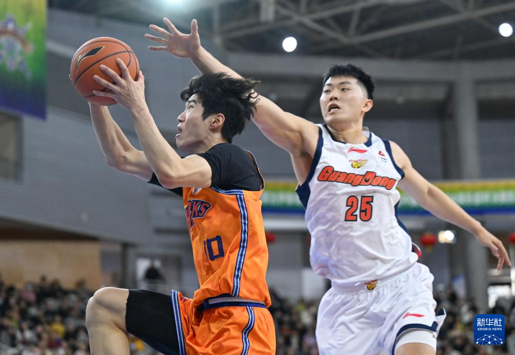 2月6日,广东东阳光队球员张皓嘉(右)在比赛中防守上海久事队球员偰李永炜。