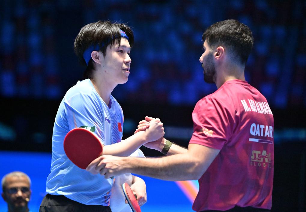 2月6日,王楚钦(左)在比赛后与穆罕默德·阿卜杜勒瓦哈卜握手。