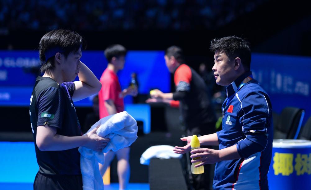 2月7日,王楚钦(左)与教练王皓在比赛暂停后交流。