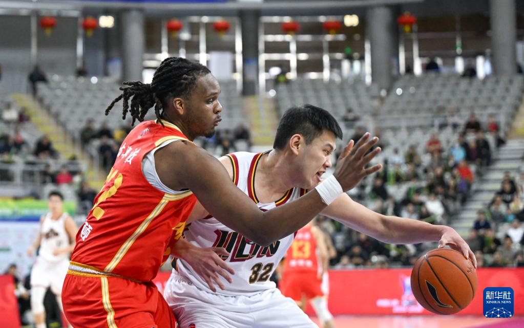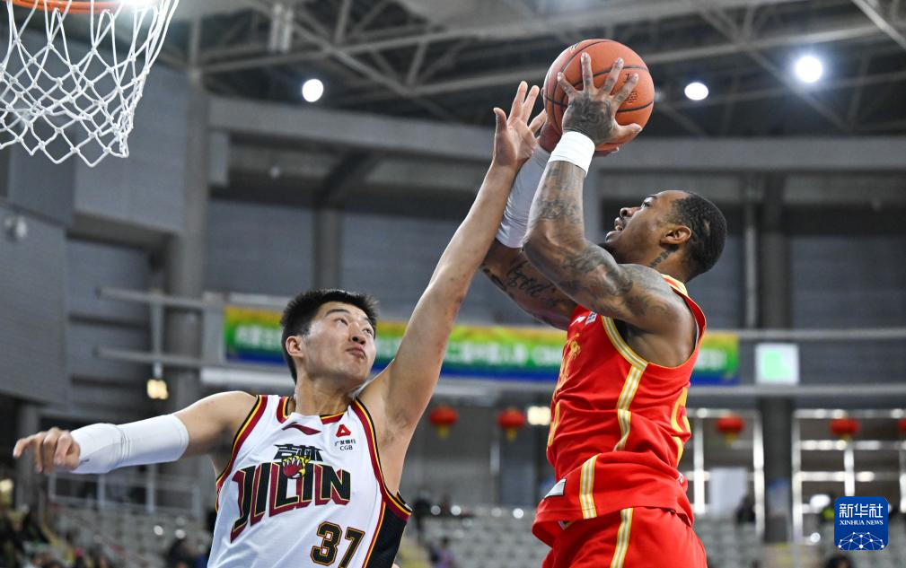2月7日,浙江方兴渡队球员卡尔顿(左)在比赛中防守吉林长白山恩都里队球员王化东。