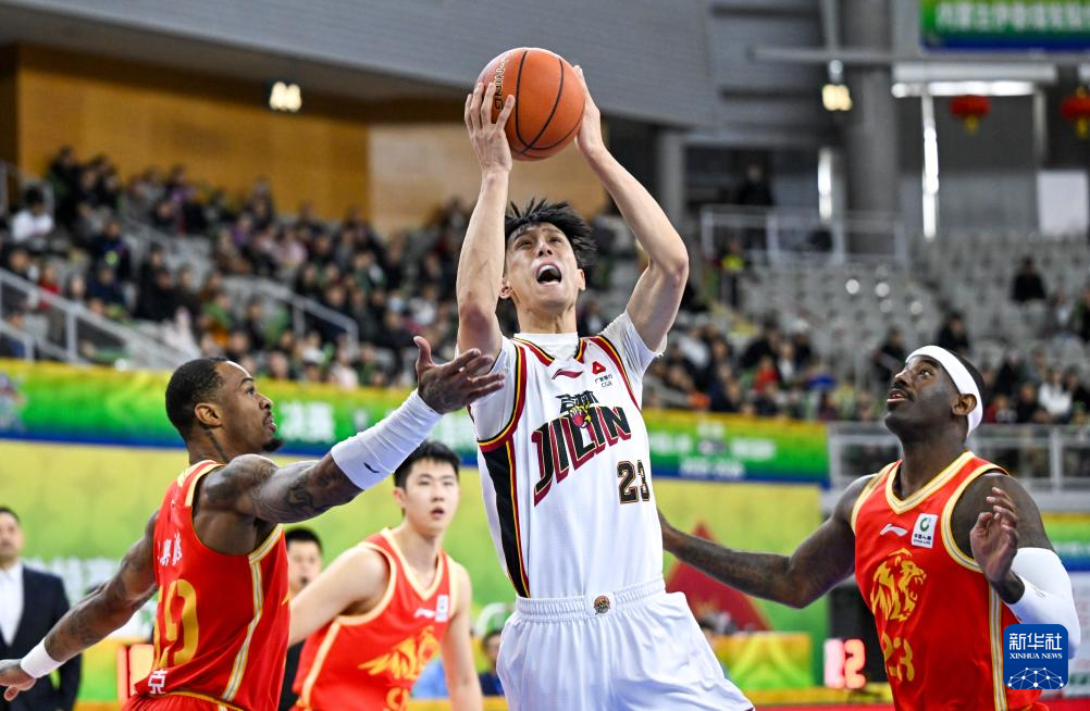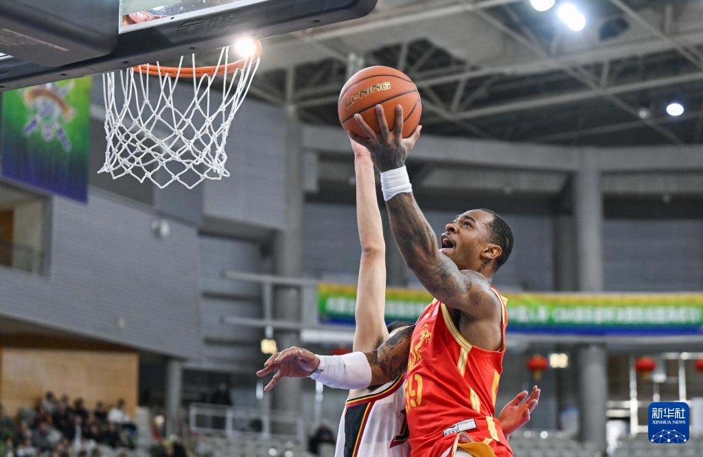 2月7日,吉林长白山恩都里队球员栾利程(前中)在比赛中上篮。