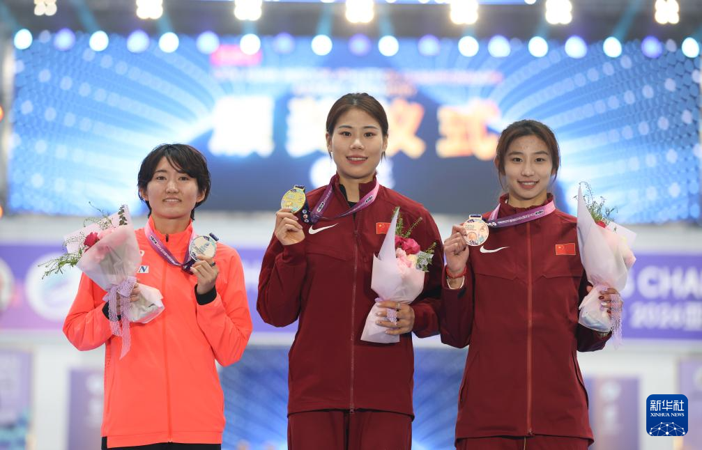 2月7日,冠军中国选手牛春格(中)、亚军日本选手诸田实咲(左)与季军中国选手危菱侠在女子撑杆跳高颁奖仪式上。