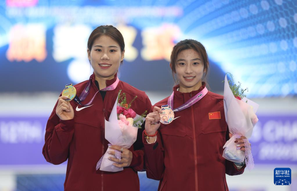 2月7日,冠军中国选手牛春格(左)、季军中国选手危菱侠在女子撑杆跳高颁奖仪式上。