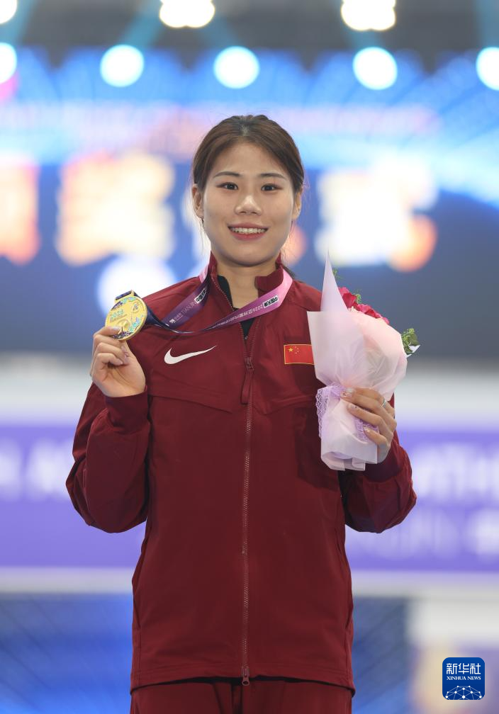 2月7日,冠军中国选手牛春格在女子撑杆跳高颁奖仪式上。