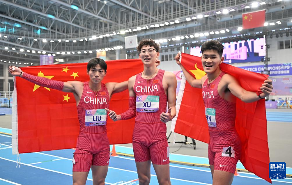 2月7日,冠军中国选手邓信锐(中)、亚军中国台北选手陈玟溥(左)和季军沙特阿拉伯选手阿卜杜拉·默罕默德在男子60米决赛颁奖仪式上。
