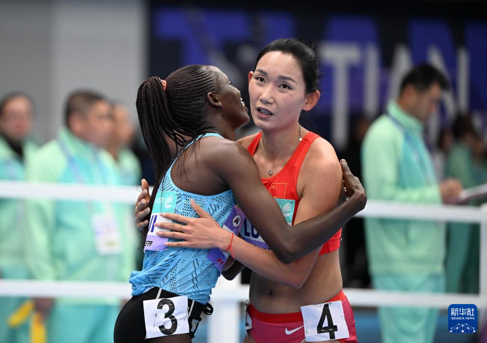 2月7日,冠军哈萨克斯坦选手诺拉·杰鲁托·塔努伊(左)和季军中国选手罗霞在比赛后拥抱。