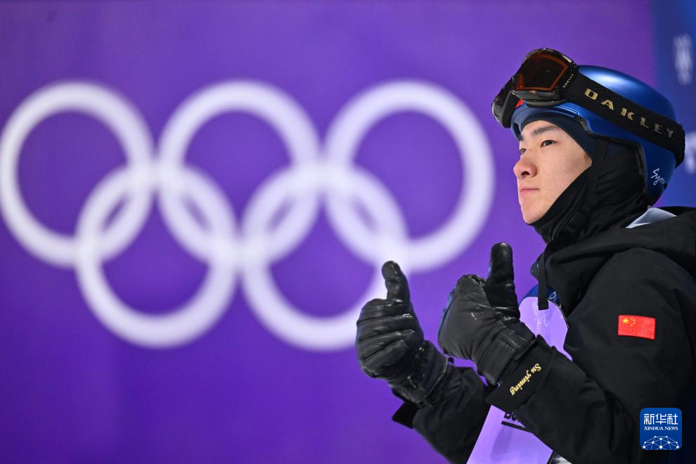 2月7日,中国选手苏翊鸣在第一跳后庆祝。