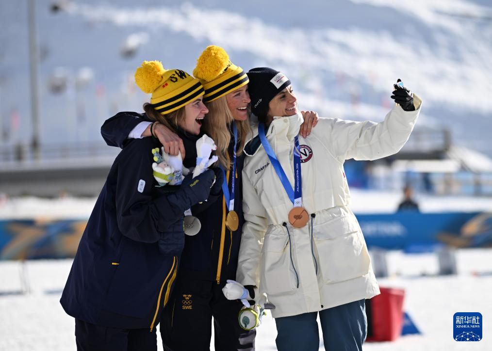 2月7日,冠军瑞典选手弗里达·卡尔松(中)、亚军瑞典选手埃芭·安德松(左)与季军挪威选手海迪·文格在颁奖仪式上自拍。