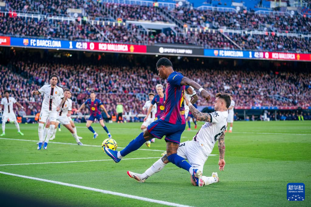 2月7日,巴塞罗那队球员拉什福德(左)与马略卡队球员马费奥在比赛中拼抢。
