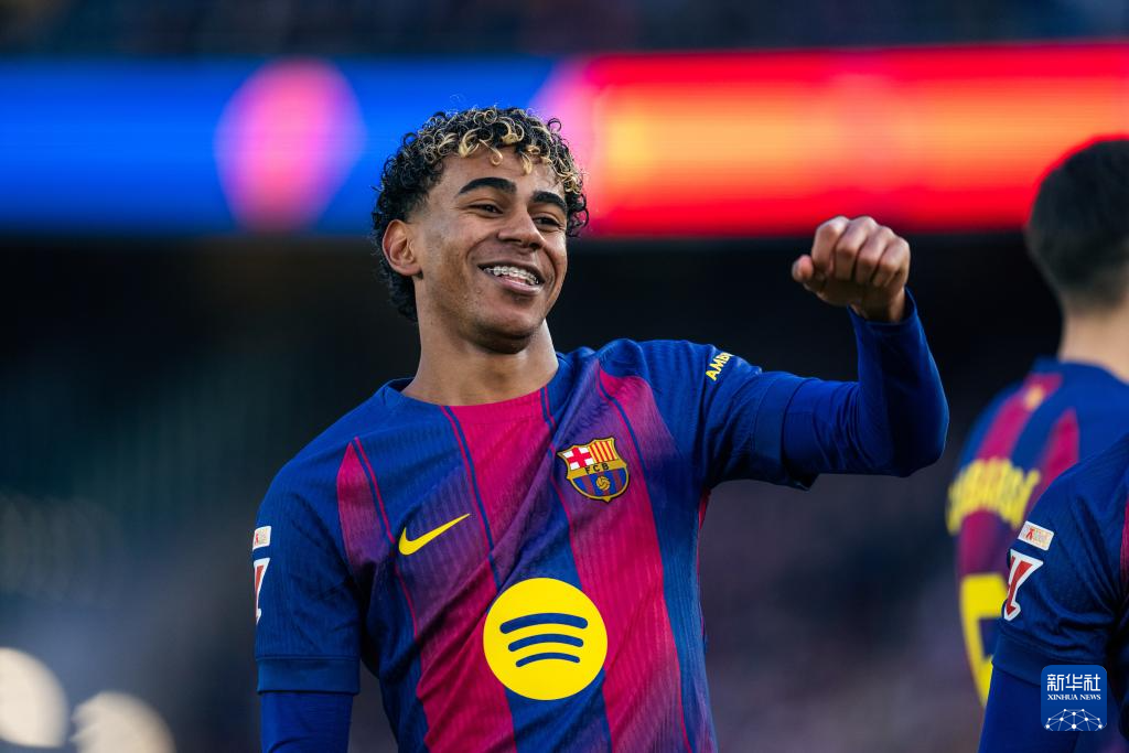2月7日,巴塞罗那队球员亚马尔在比赛中庆祝进球。