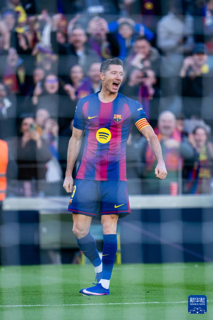 2月7日,巴塞罗那队球员莱万多夫斯基在比赛中庆祝进球。