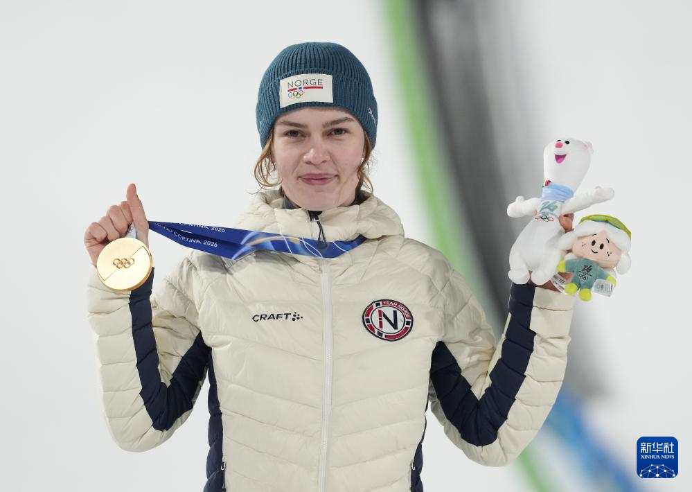 2月7日,冠军挪威选手安娜·奥迪娜·施特勒姆在颁奖仪式上。