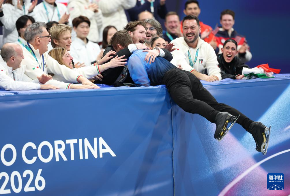 2月8日,意大利队选手里佐(中)在团体赛男单自由滑完赛后拥抱队友。