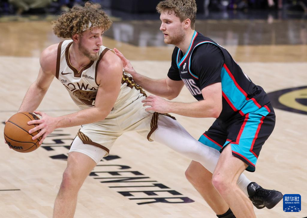 2月9日,勇士队球员波辛斯基(左)在比赛中进攻。