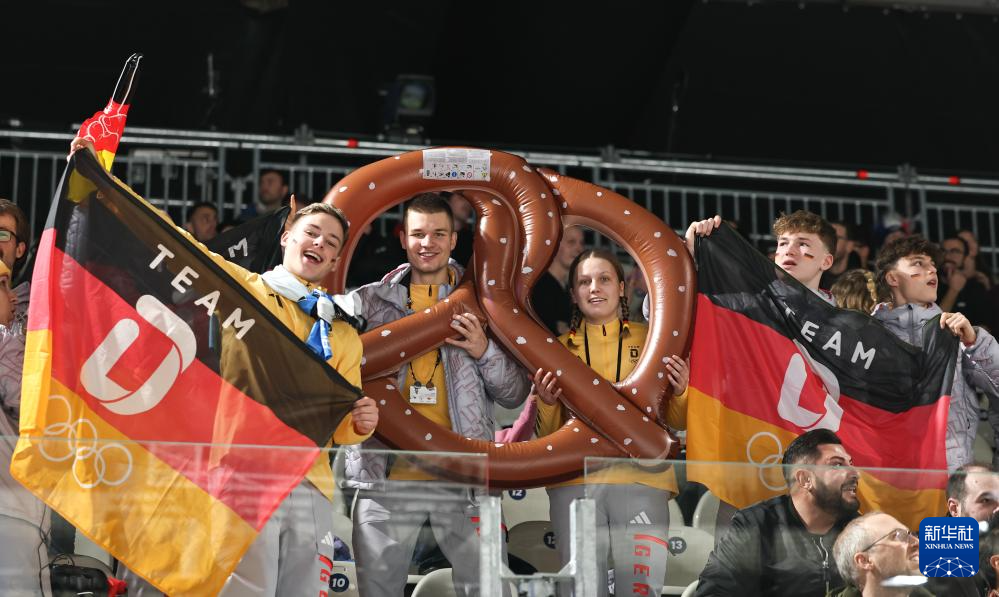 2月9日,法国队球迷头戴巴黎奥运会装饰帽子在赛前加油助威。