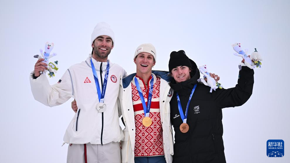 2月10日,冠军挪威选手比尔克·鲁德(中)、亚军美国选手亚历克斯·霍尔(左)和季军新西兰选手卢卡·哈林顿在颁奖仪式上。