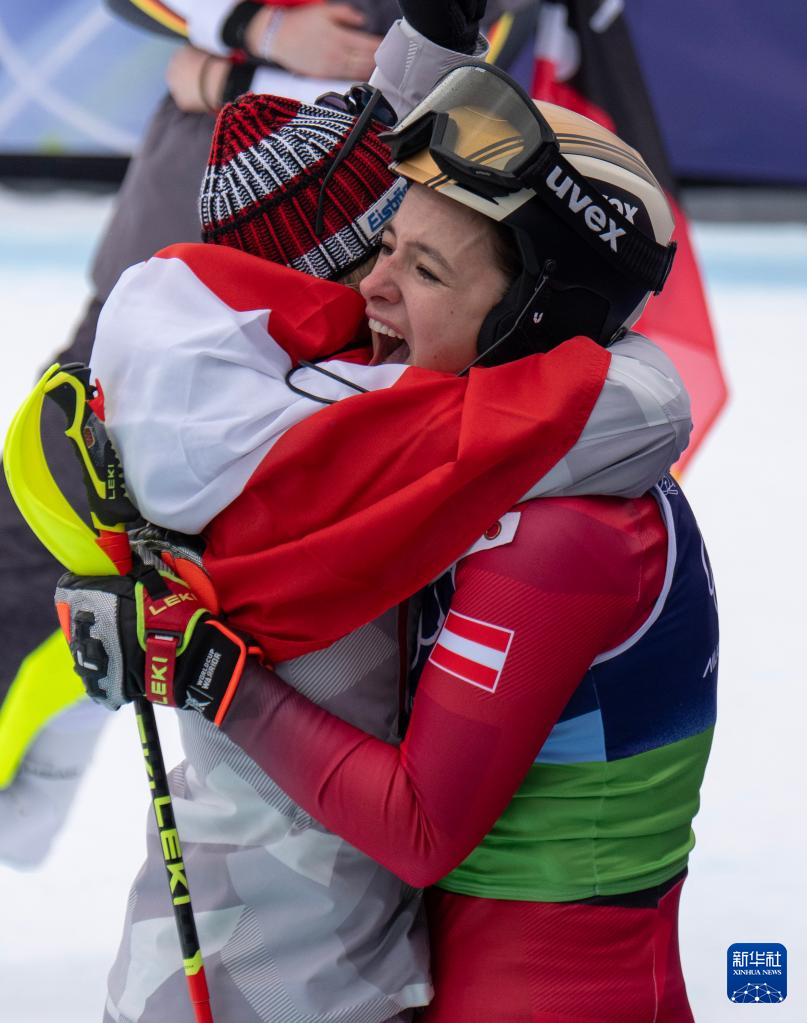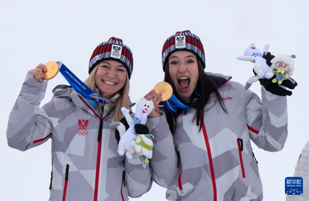 2月10日,冠军奥地利2队组合雷德勒(左)/胡贝尔在比赛后庆祝。