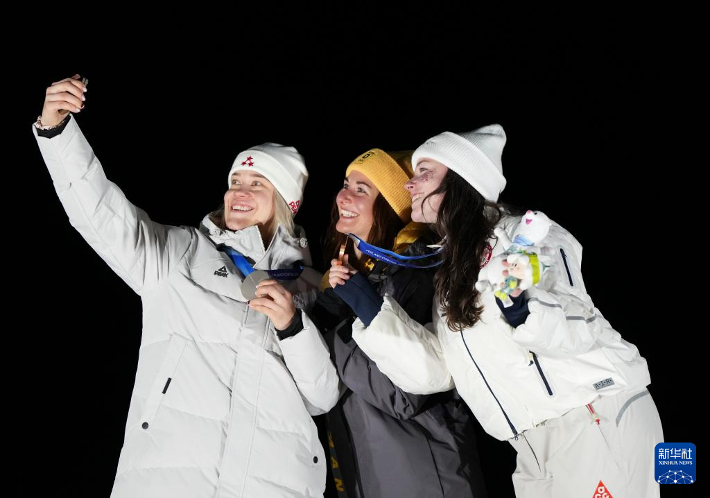 2月10日,冠军德国选手陶比茨(中),亚军拉脱维亚选手博塔(左),季军美国选手阿什莉·法夸尔森在颁奖仪式上合影。