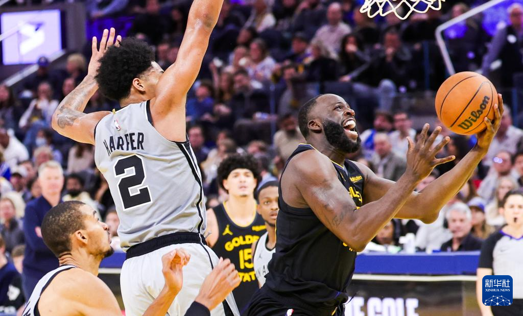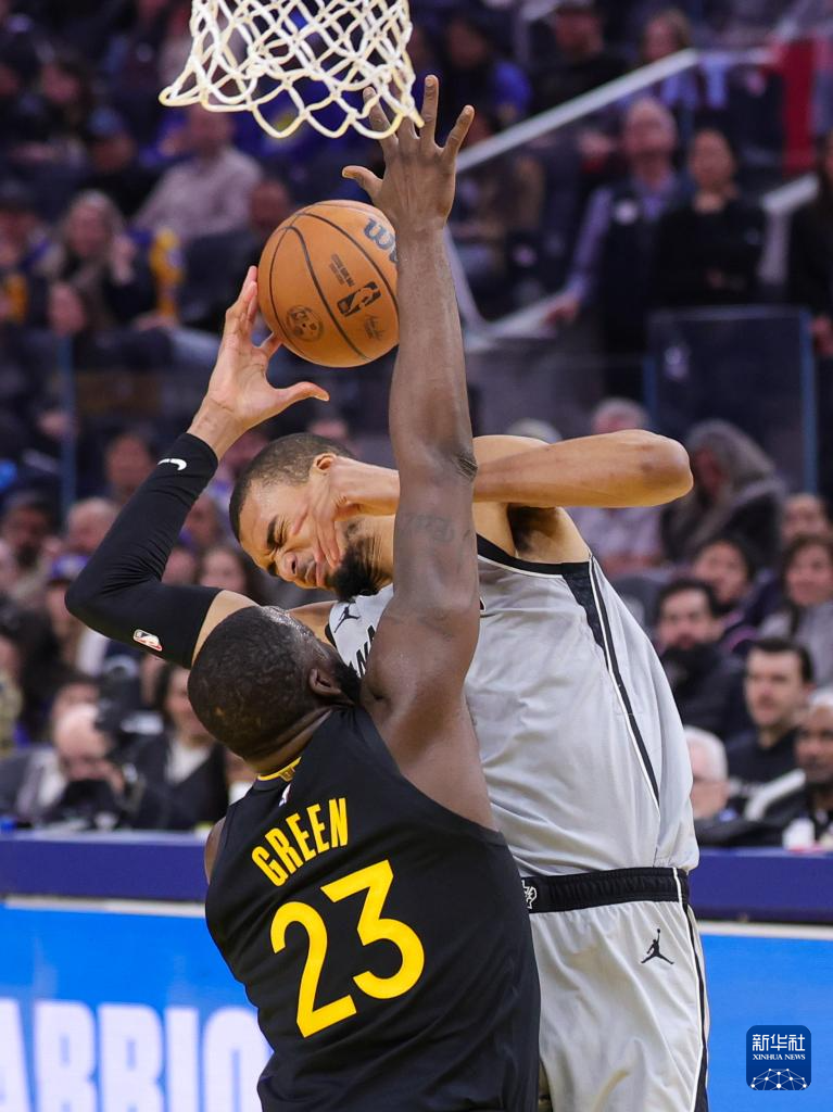 2月11日,勇士队球员格林(左)在比赛中防守马刺队球员文班亚马。