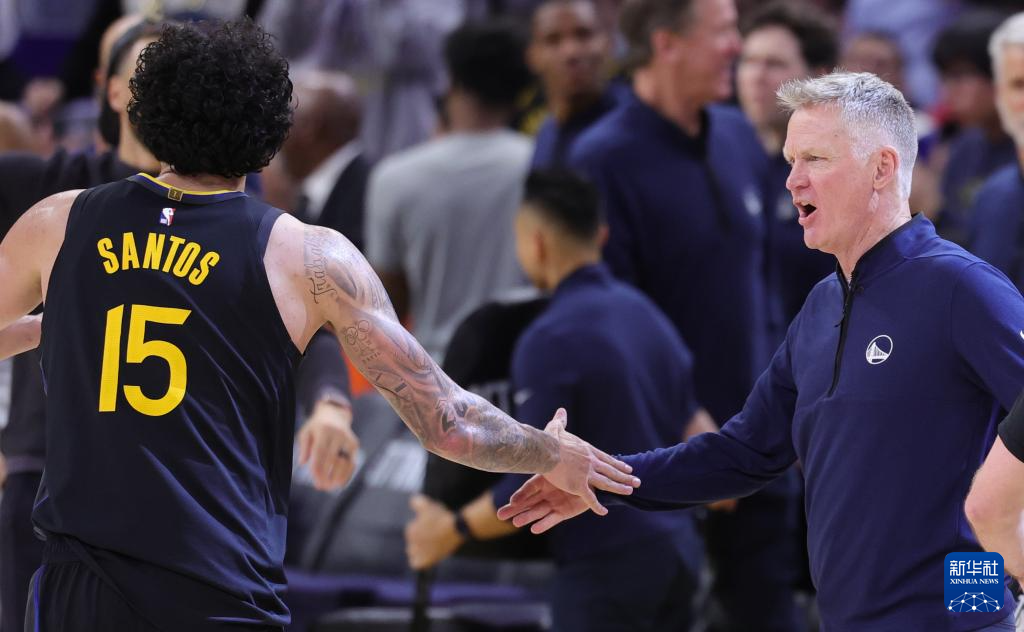 2月11日,勇士队教练科尔(右)鼓励队员桑托斯。