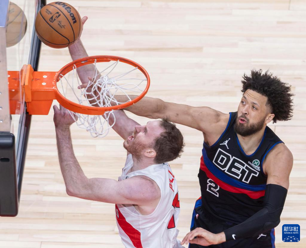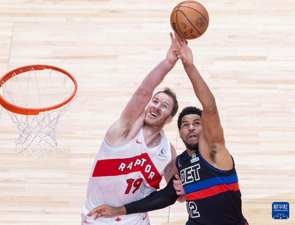 2月11日,猛龙队球员珀尔特尔(左)与活塞队球员哈里斯在比赛中争抢篮板球。