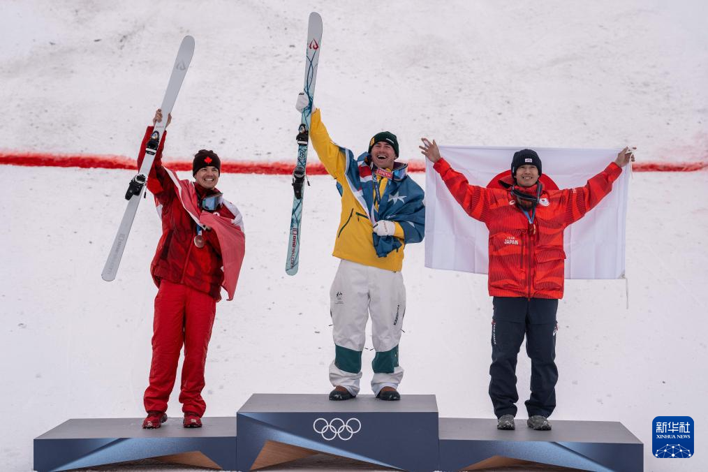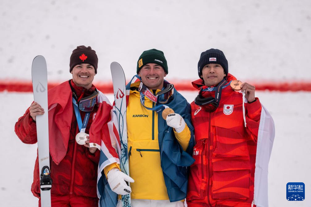 2月12日,冠军澳大利亚选手库珀·伍兹(中)、亚军加拿大选手米凯尔·金斯伯里(左)和季军日本选手堀岛行真在颁奖仪式上。