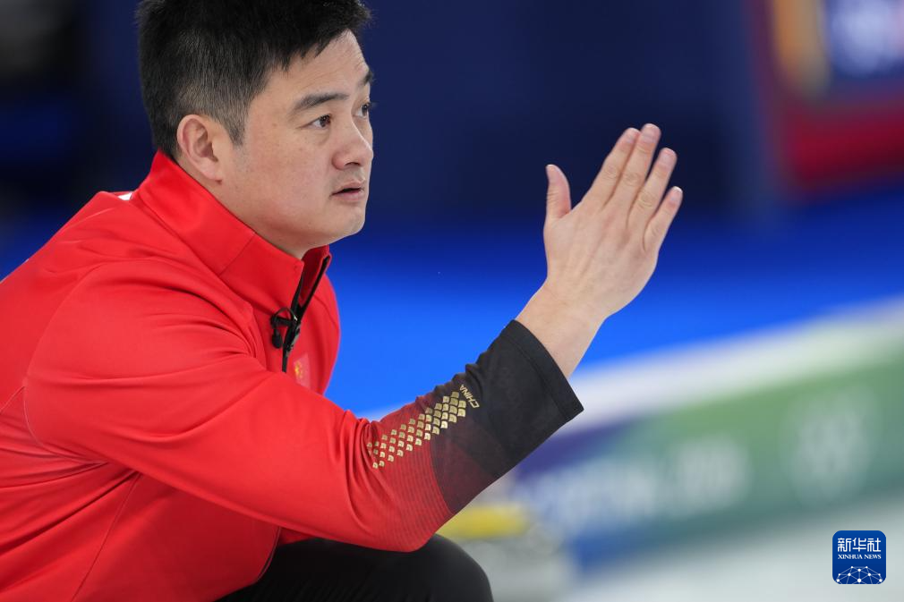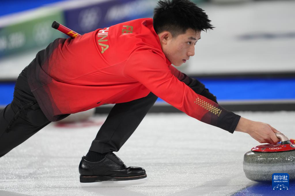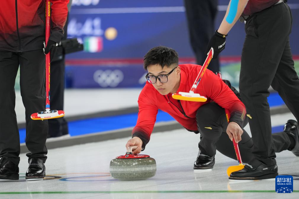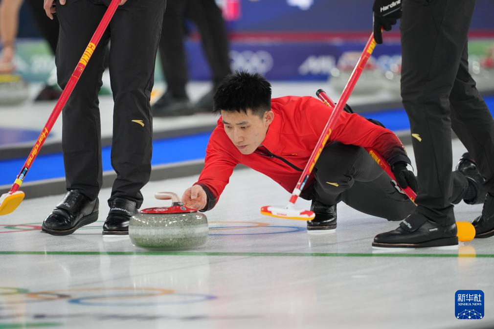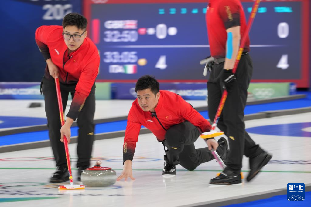 2月13日,中国队选手李智超(中)在比赛中掷壶。