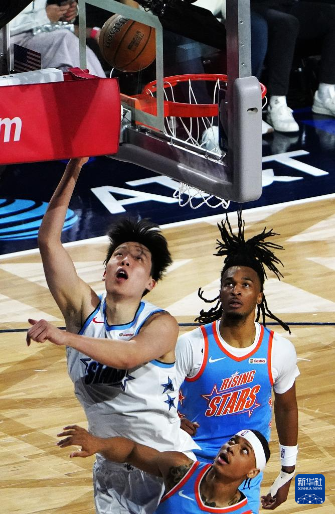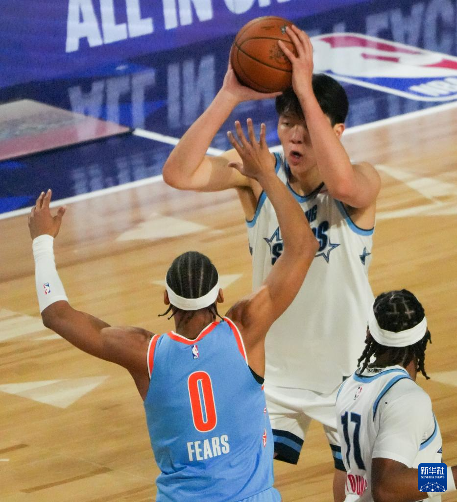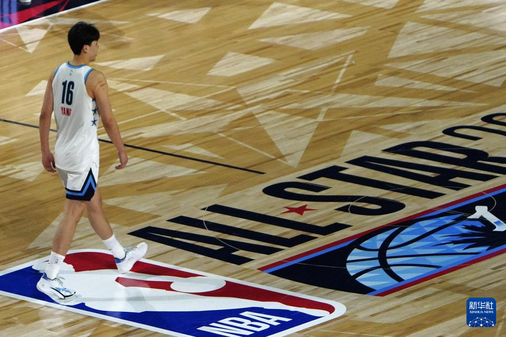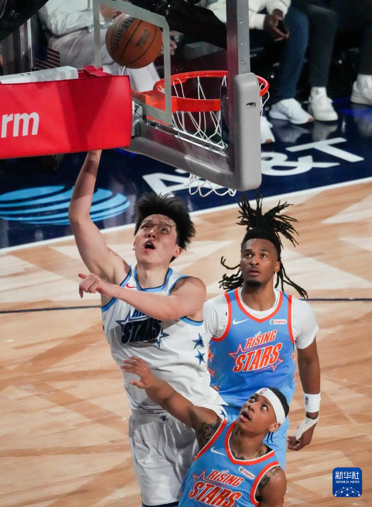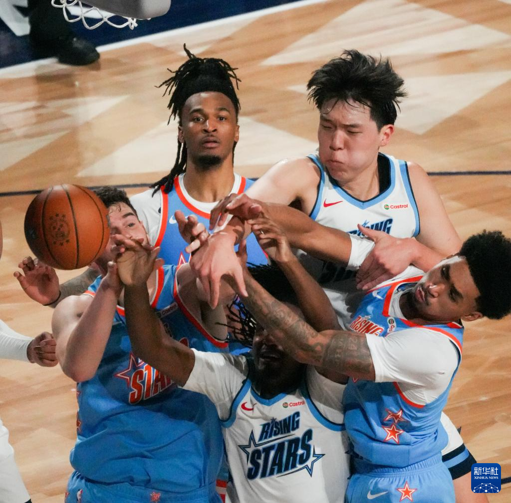 当地时间2月13日,美国职业男篮联赛(NBA)全明星新秀赛在洛杉矶举行,里弗斯队34比40不敌安东尼队。中国球员杨瀚森替补出场,为里弗斯队拿下10分。