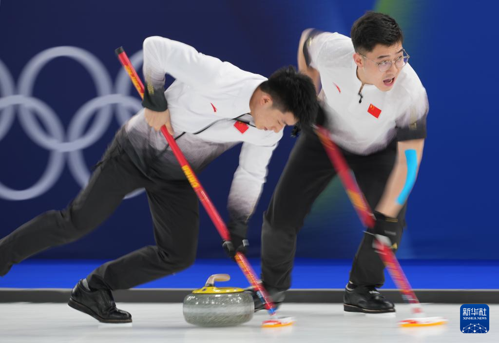 2月13日,中国队选手费学清(中)在比赛中掷壶。