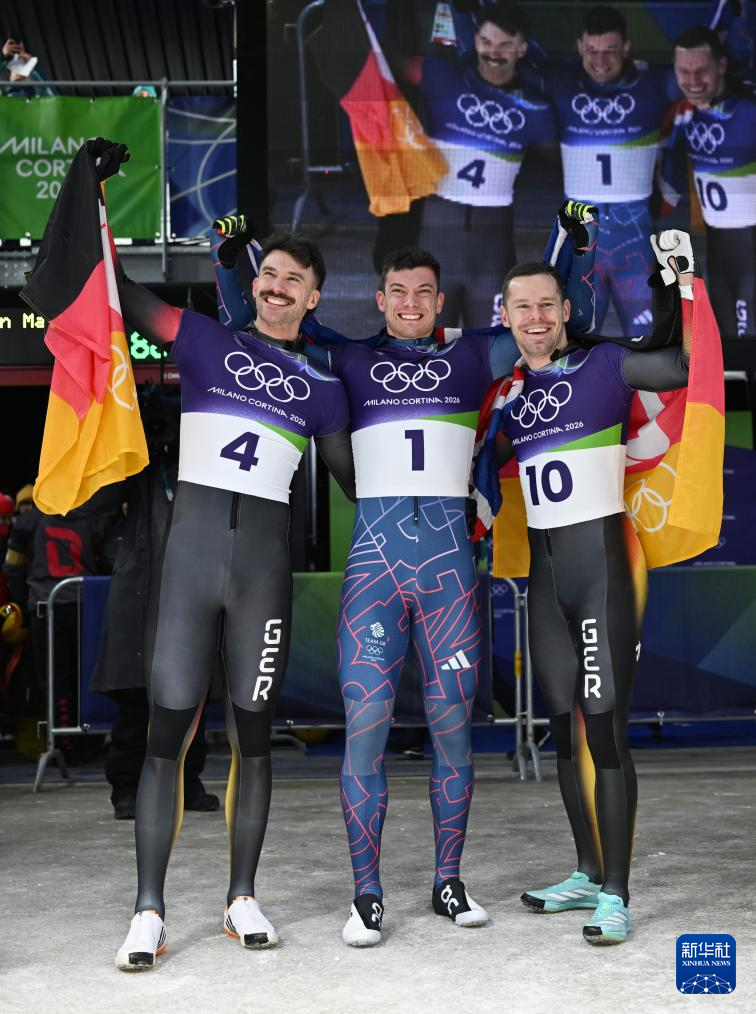 2月13日,冠军英国选手韦斯顿(中)、亚军德国选手容克(左)和季军德国选手格罗特赫尔在颁奖仪式上自拍。