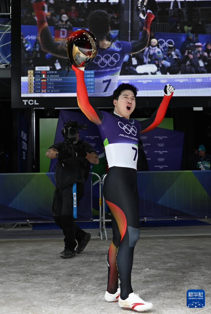 2月13日,中国选手陈文浩在第四轮比赛后庆祝。他获得第四名。