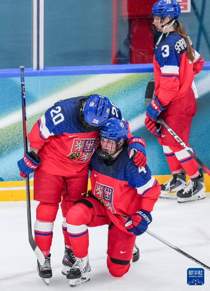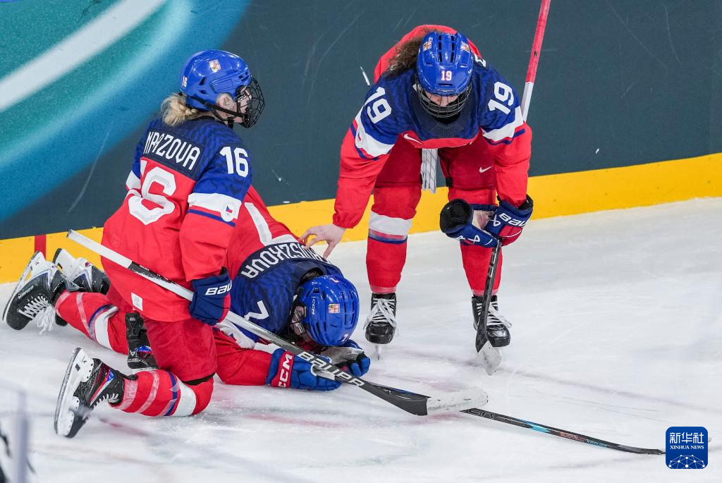 2月13日,捷克队球员芭尔博拉·尤日奇科娃 (前左)在比赛中查看队友达妮埃拉·佩绍娃(前右)的情况。