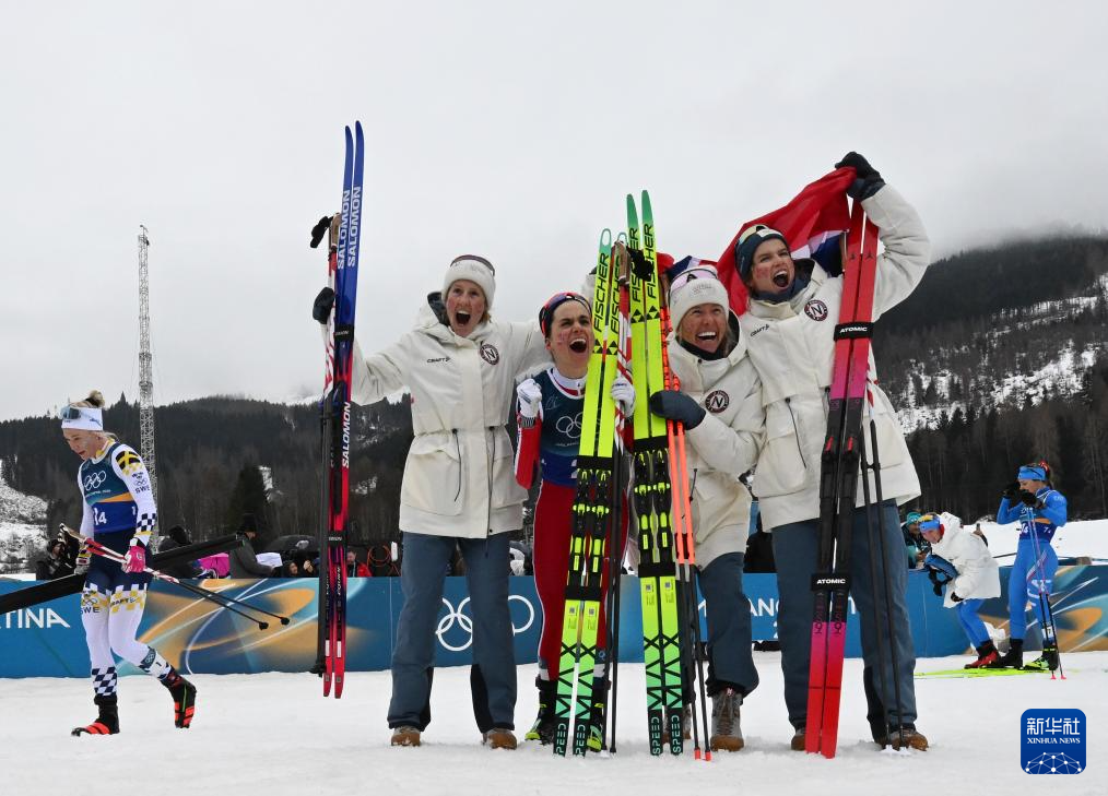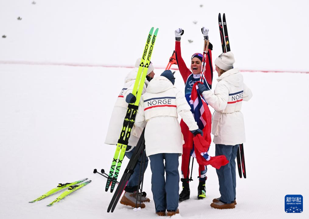 2月14日,挪威队选手海迪·文格(右二)在冲线后与队友庆祝。挪威队获得冠军。
