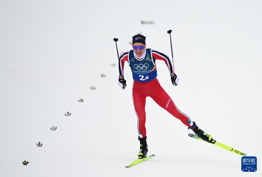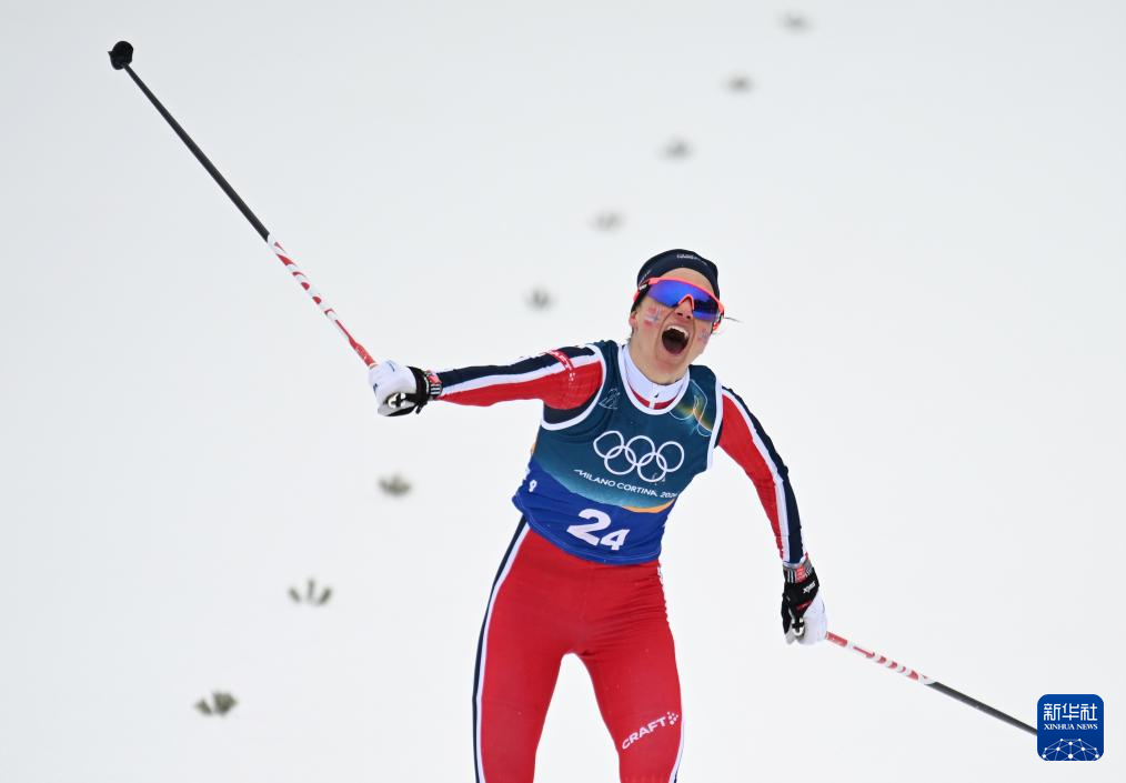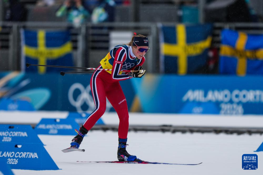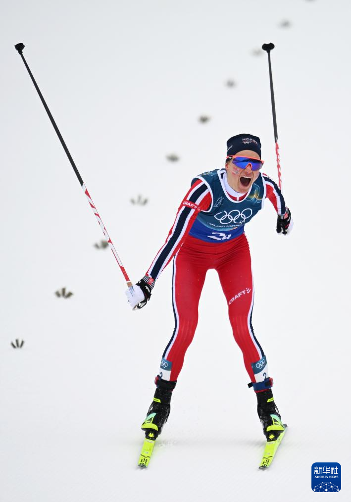 2月14日,挪威队选手海迪·文格在比赛中冲线。