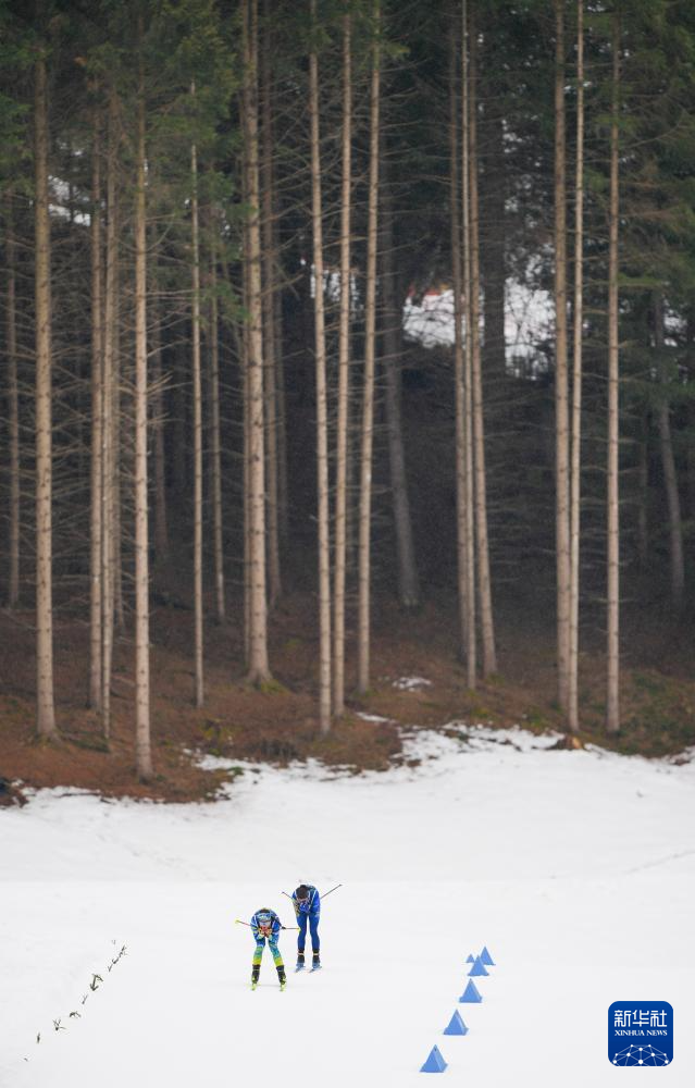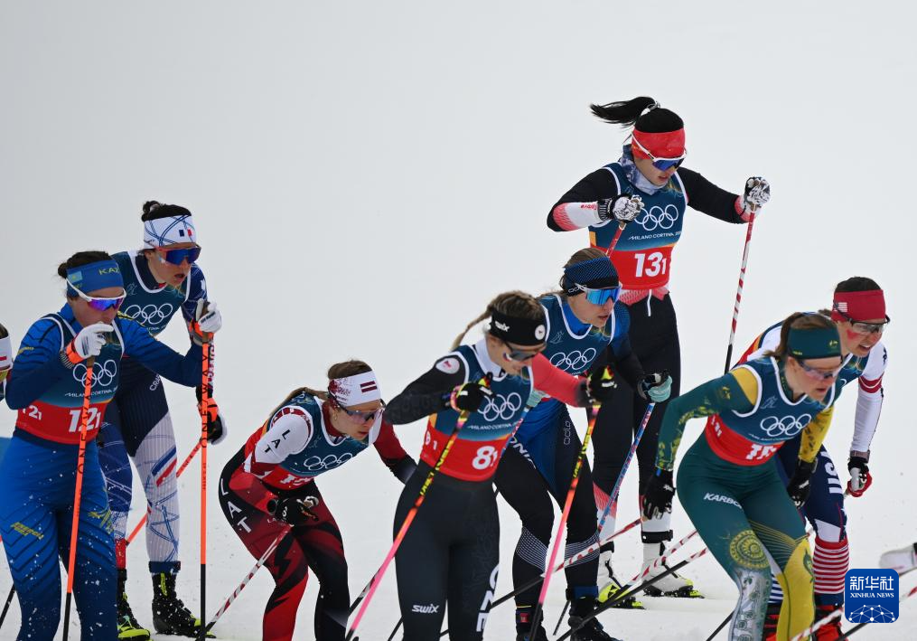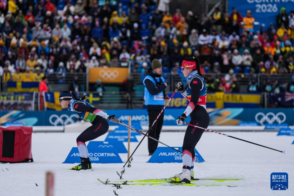 2月14日,中国队选手迪妮格尔·衣拉木江(右)、池春雪在比赛中。中国队获得第19名。