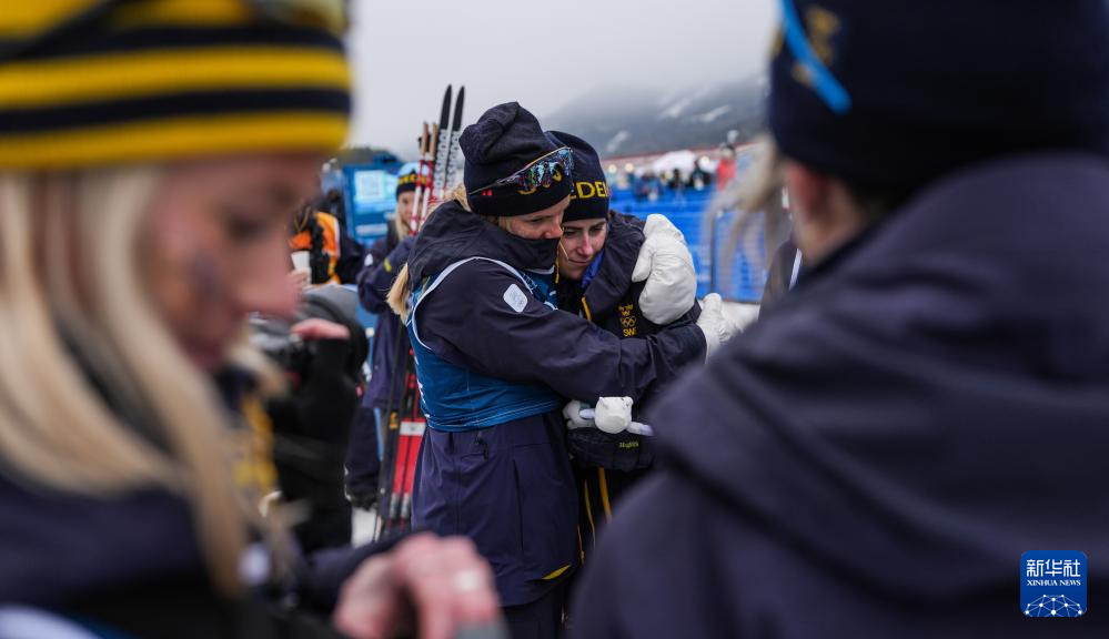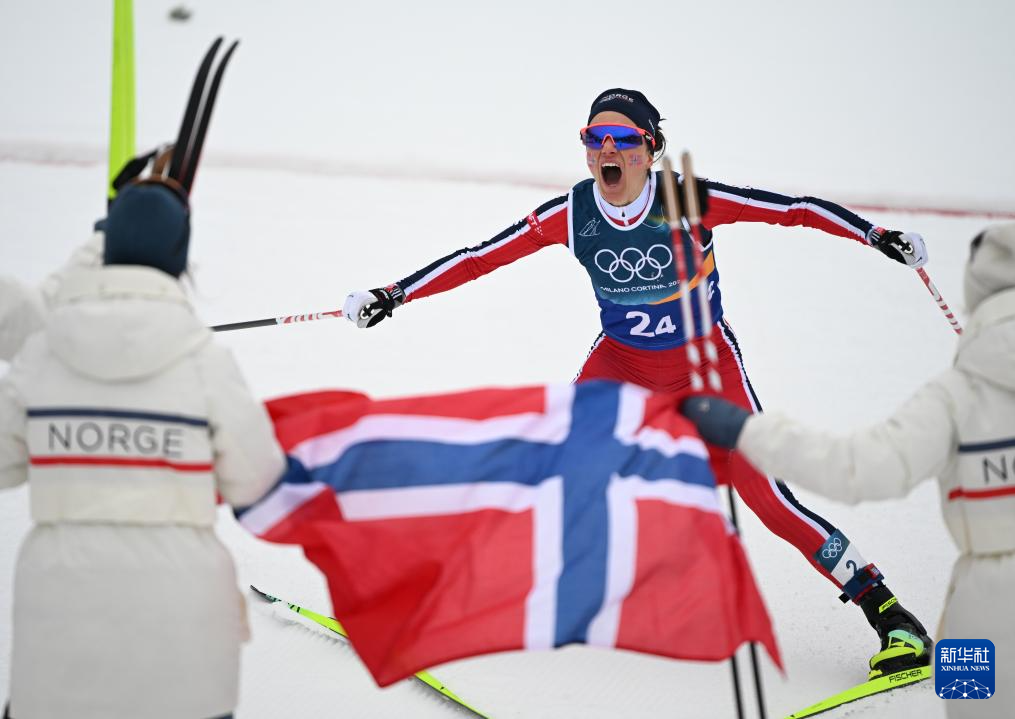 2月14日,挪威队选手海迪·文格(右)在冲线后与队友庆祝。挪威队获得冠军。