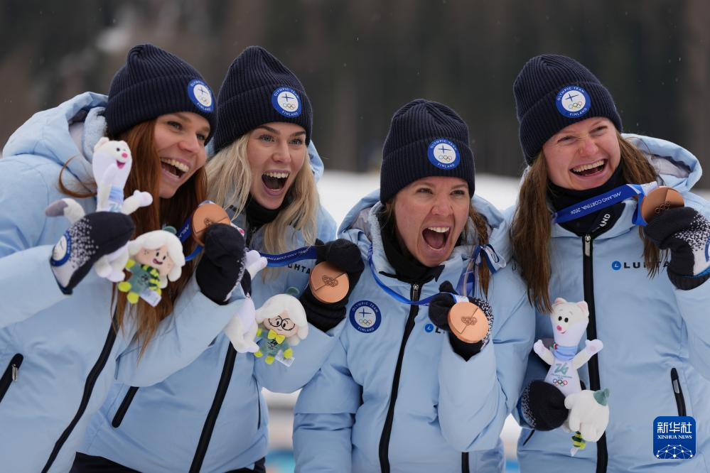 2月14日,获得季军的芬兰队选手约翰娜·马廷塔洛、凯尔图·尼斯卡宁、维尔玛·吕吕蒂和雅斯米·延苏(从右到左)在颁奖仪式上合影。