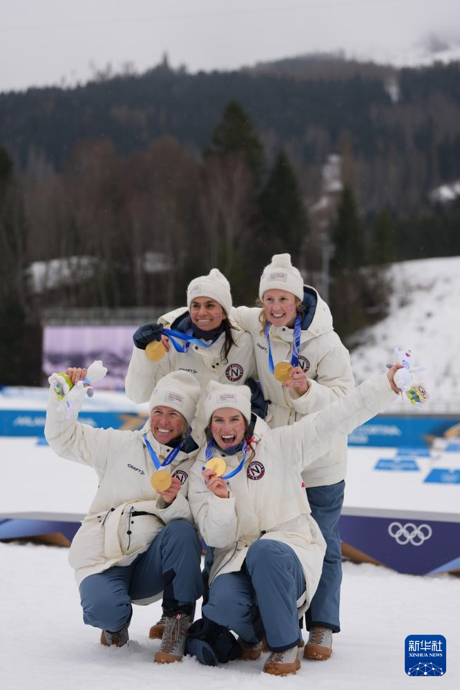 2月14日,获得冠军的挪威队选手克里斯廷·奥斯特古伦·福斯内斯(前右)、阿斯特丽德·厄伊勒·斯林德(前左)、卡罗琳·辛普森-拉尔森(后右)和海迪·文格在颁奖仪式上合影。