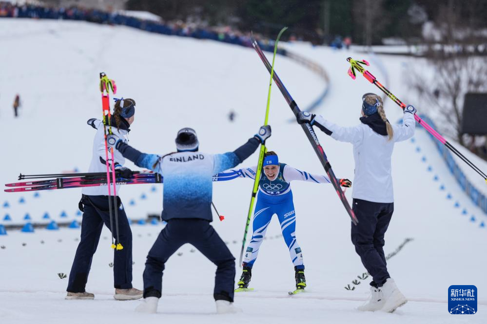 2月14日,芬兰队选手雅斯米·延苏(右二)在冲线后庆祝。芬兰队获得季军。
