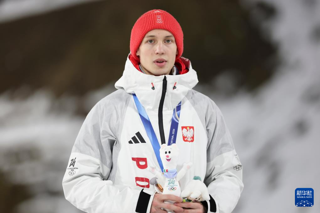 2月14日,季军波兰选手托马夏克在颁奖仪式上。