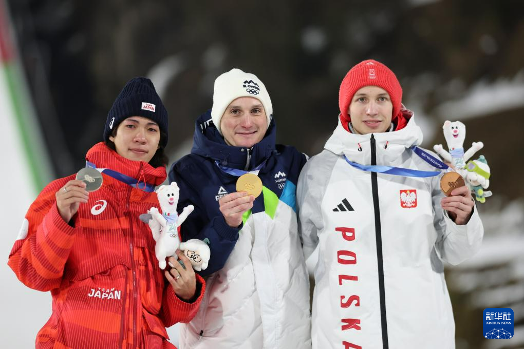 2月14日,冠军斯洛文尼亚选手多门·普雷夫茨(中)、亚军日本选手二阶堂莲(左)和季军波兰选手托马夏克在颁奖仪式上。