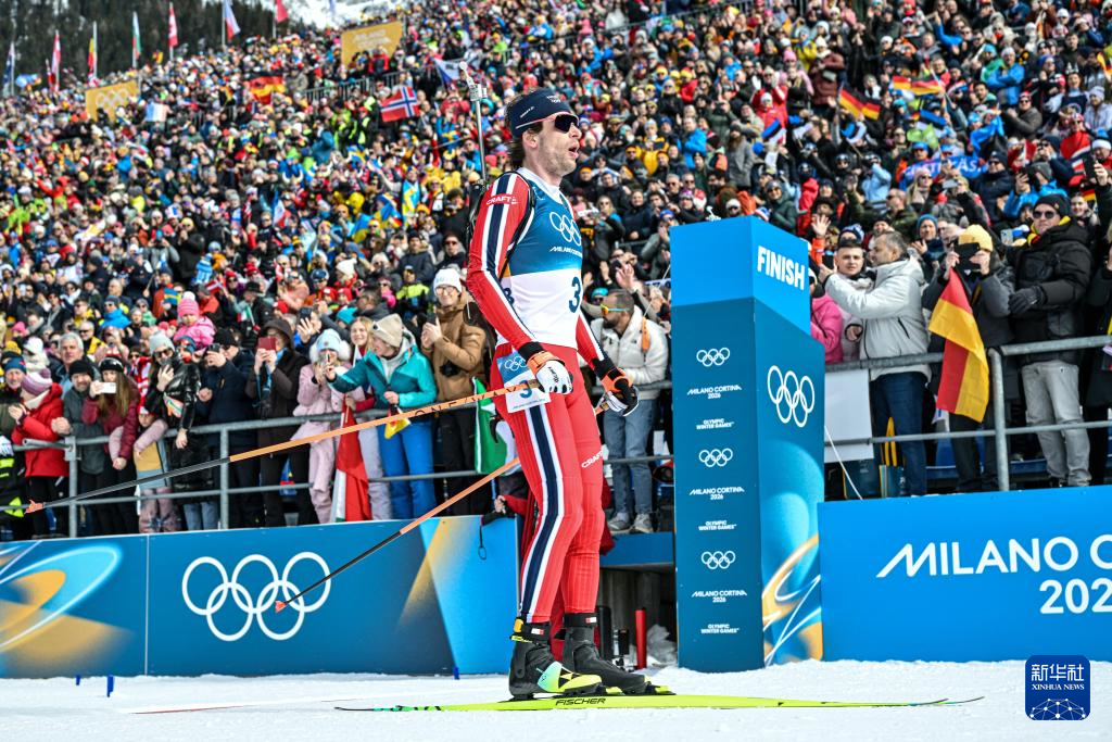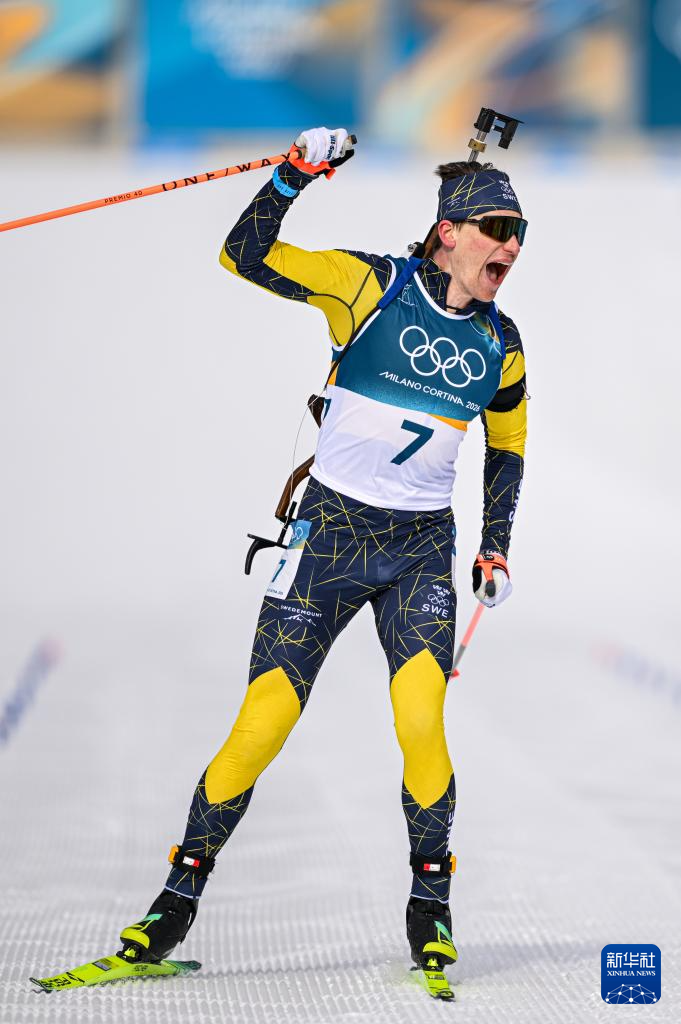 2月15日,获得冠军的瑞典选手蓬西卢奥马在冲线后庆祝。