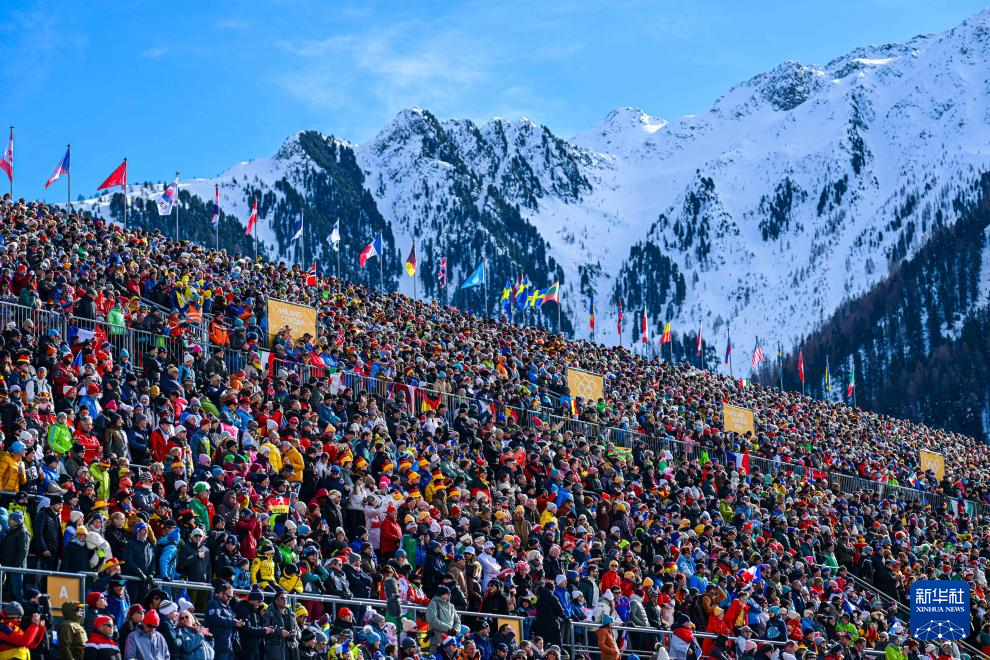 2月15日,观众在意大利安泰塞尔瓦冬季两项竞技场观看比赛。