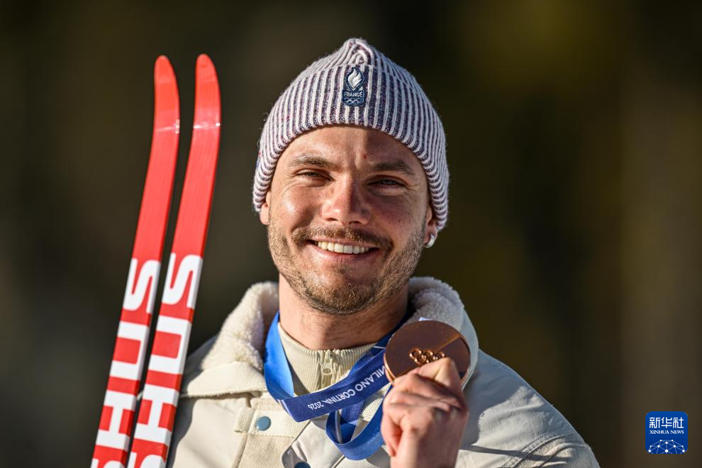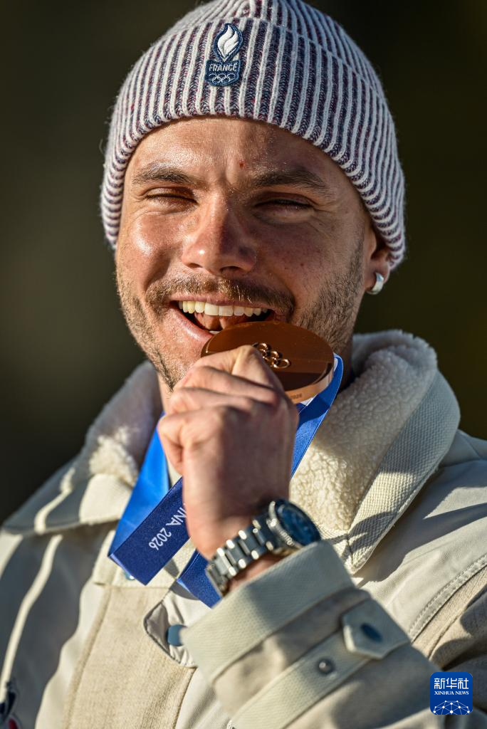 2月15日,季军法国选手雅克兰在颁奖仪式上庆祝。