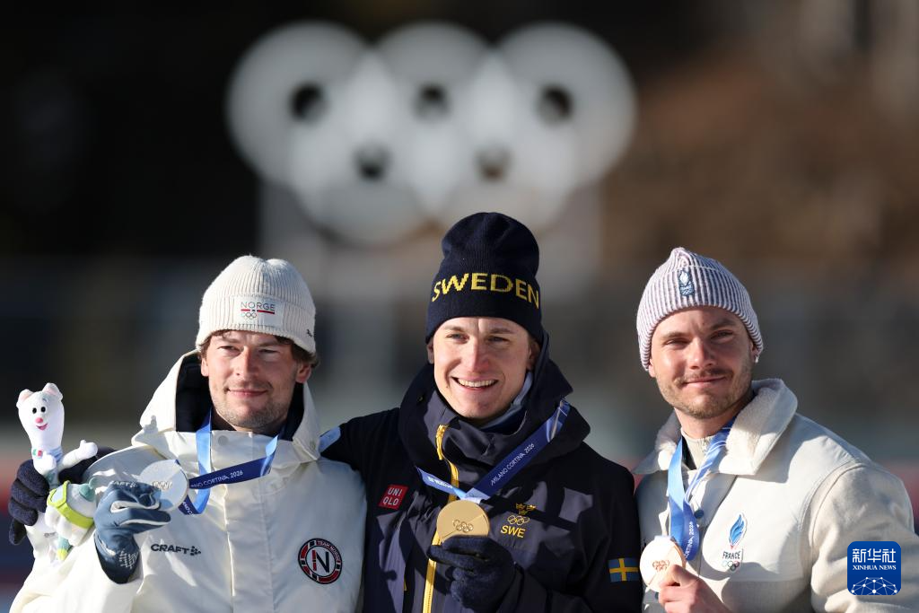 2月15日,亚军挪威选手莱格雷德、冠军瑞典选手蓬西卢奥马、季军法国选手雅克兰(从左至右)在颁奖仪式上合影。