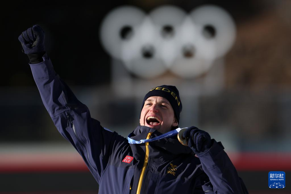 2月15日,冠军瑞典选手蓬西卢奥马在颁奖仪式上庆祝。