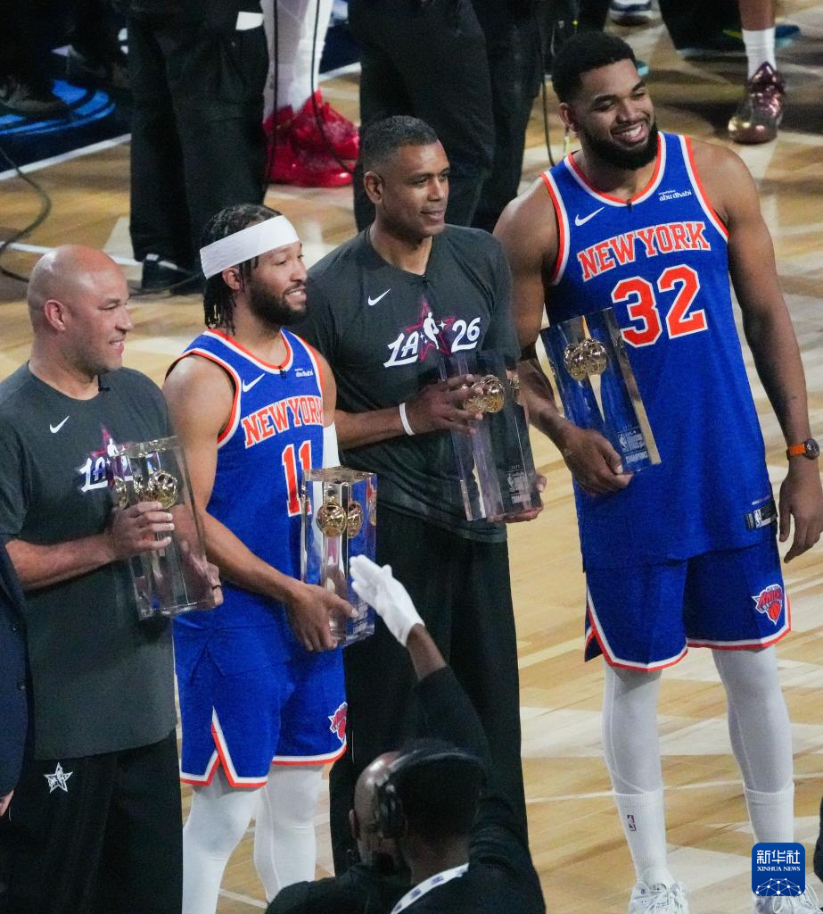 2月14日,尼克斯队球员杰伦·布伦森(左二)和队友卡尔·安东尼·唐斯(右二)在赢得全明星投篮之星大赛后捧起冠军奖杯。