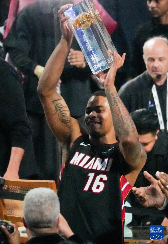 2月14日,热火队球员凯沙德·约翰逊在全明星扣篮大赛后捧起冠军奖杯。